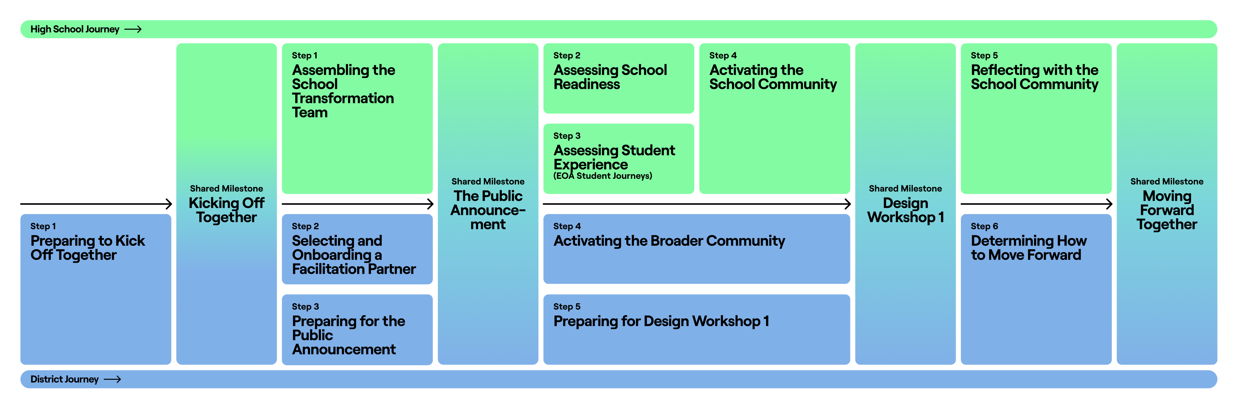 In this phase of the journey, districts and high schools come together to kick off the work of high school transformation. Throughout this phase, districts and high schools undertake parallel, complementary work with the ultimate goal of determining which schools are interested and ready to move forward with the transformation process.